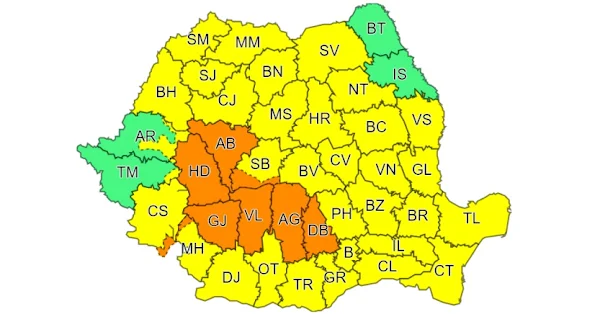 Șase județe se află sub avertizare Cod Portocaliu. Conform meteorologilor, în nordul Olteniei, nord-vestul Munteniei și sud-vestul Transilvaniei vor fi perioade cu averse torențiale. În intervale scurte de timp, dar mai ales prin acumulare, se vor înregistra cantități de apă de 40...50 l/mp și pe arii restrânse de peste 60...70 l/mp.