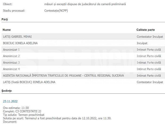 „Respinge cererile şi excepţiile formulate/invocate, prin avocat ales, de inculpaţii LATIŞ (fostă BOICIUC) IONELA ADELINA şi LATIŞ GABRIEL, ca neîntemeiate. Constată competenţa materială şi teritorială a Tribunalului Suceava şi legalitatea sesizării instanţei cu rechizitoriul nr. 209D/P/2016 al P.Î.C.C.J. – Direcţia de Investigare a Infracţiunilor de Criminalitate Organizată şi Terorism – Serviciul Teritorial Suceava, privind pe inculpaţii : 1. LATIŞ (fostă BOICIUC) IONELA ADELINA, trimisă în judecată pentru săvârşirea infracţiunilor de: trafic de minori și proxenetism; 2. LATIŞ GABRIEL MIHAI, trimis în judecată pentru săvârşirea infracţiunilor de: trafic de minori, proxenetism, act sexual cu un minor, folosirea prostituţiei infantile. Dispune începerea judecăţii cauzei ce formează obiectul dosarului nr. 4016/86/2021 al Tribunalului Suceava, privind pe inculpaţii LATIŞ (fostă BOICIUC) IONELA ADELINA şi LATIŞ GABRIEL, urmând ca termenul de judecată şi măsurile procesuale care se impun, să fie dispuse după rămânerea definitivă a prezentei încheieri. Cu drept de contestaţie în termen de 3 zile de la comunicare”, este decizia contestată de proxeneți.